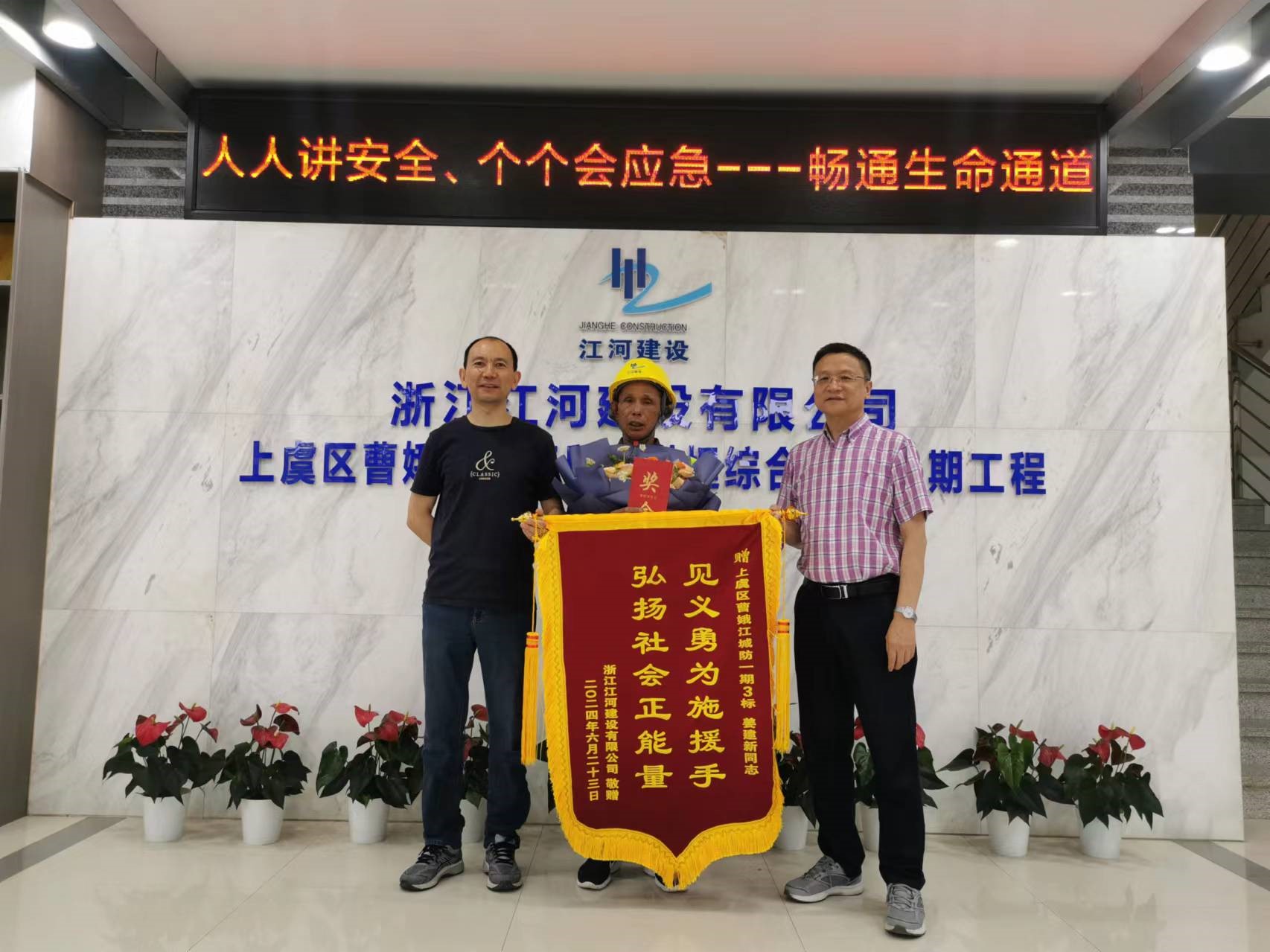 6月23日,公司副總裁張堅和工會、工管中心等有關負責人到上虞城防一期3標項目部工地對勇救落水者的工人...