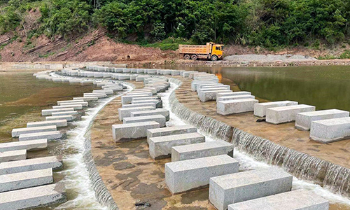 在水利工地現場,2座攔水堰已具雛形。河水流過汀步石間,波光粼粼,形成一道美麗的風景線,令人心曠神怡。
