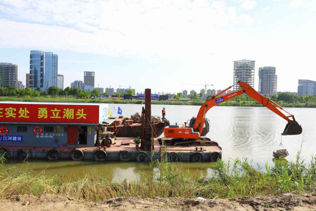 我司作為本次演練活動的協辦單位,不僅完成了前期演練場地平整工作,在演練中還負責實施了堤防險情應急處置科目中的船拋石籠防沖、插打板樁圍堰進行堤腳加固二個子科目。我司搶險隊員工20人作為上虞區水利局搶險隊代表參加了列隊演練。