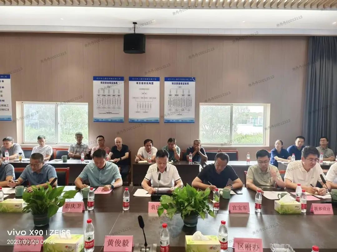 9月20日上午,上虞區海塘安瀾工程項目部召開上虞海塘安瀾工程“保安提質促投資”項目推進會,上虞區副區長黃俊毅、上虞水投集團董事長陳海華等出席,公司董事長袁偉忠代表施工單位發言。
