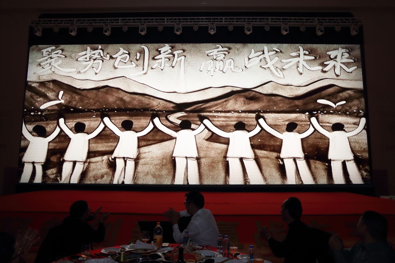 揚沙、漏沙、推沙、切沙……現場還邀請了“用沙作畫,以沙為墨”的沙畫表演,給現場觀者夢幻般的視覺享受。一捧黃沙經過沙畫師的手在沙盤上翻飛,描繪了公司上虞區海塘安瀾工程、洛陽石化百萬噸乙烯配套項目洛陽石化百萬噸乙烯配套項目—道路工程、金華金義快速路工程、施秉縣白頭旺水庫大壩樞紐、欒川叫河鎮山河溝治理工程、河南龍泉河生態谷濕地工程等多個項目。沙粒在指間流淌,化作山川與河流,描繪出項目的壯麗與宏偉。每一粒沙,仿佛都在訴說著項目上的故事。