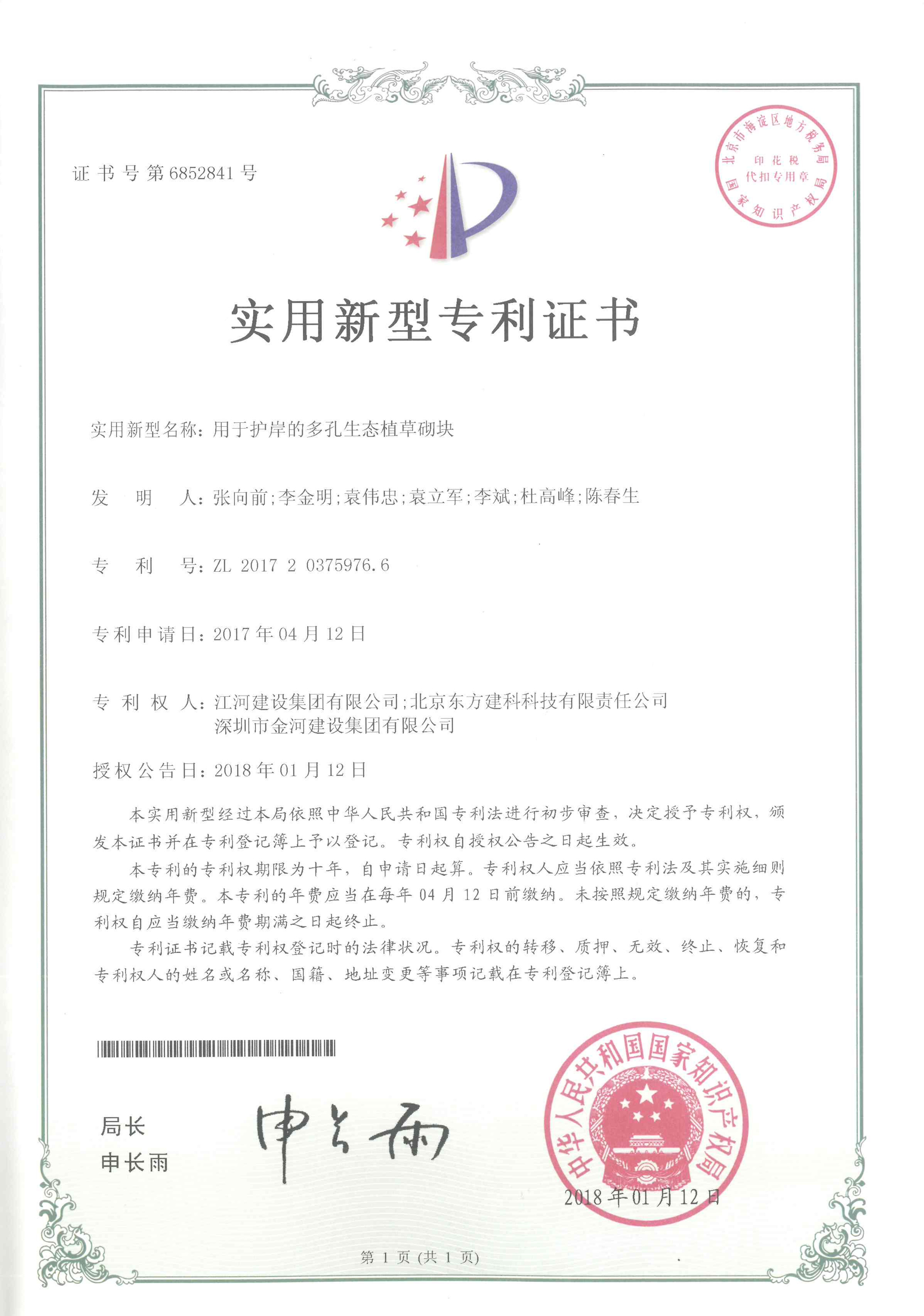 近日,我公司和北京東方建科科技有限責任公司、深圳市金河建設集團有限公司共同申報的“用于護岸的多孔生態植草砌塊”技術通過了國家知識產權局的批準,獲得了國家實用新型專利授權。該項專利公開了一種用于護岸的多孔生態植草砌塊,包括多孔質骨架、營養基材、植物種子,解決了大型坡面綠化時普通綠化磚效果差、施工困難的問題,也解決了現場施工耗時長的問題,鋪設至坡面后,可實現植物與砌塊一體化生長,更有效綠化護岸,減少了施工時間,具有結構合理、安裝方便、批量生產加工容易的優點。