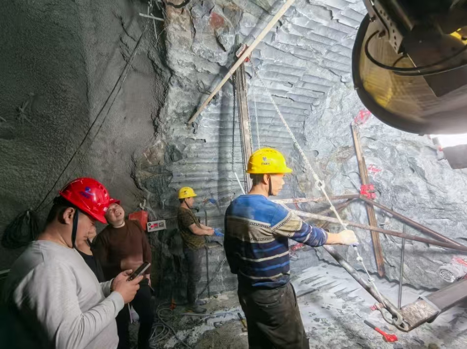 據項目負責人介紹,引水發電洞需穿越2.5m-3m厚的強風化帶,密集發育的斷層破碎帶縱橫交錯,巖體破碎如“流沙;更棘手的是高地應力帶來的圍巖大變形,地層堪稱地質“魔方”,施工難度猶如如履薄冰。施工技術方案是骨架,項目部建設者們堅持揚“執著專注,精益求精,一絲不茍,追求卓越”的工匠精神,工程師們經過反復研討和計算與復核,最終采用“鉆→劈→運”高效、安全的總體施工方案。第一步、“鉆”臨空面鉆孔,用取芯鉆機在輪 廓線上批量引孔,快速形成臨空面;第二步、“劈”,集成多臺液壓劈裂棒進行巖石分塊;第三步、“運”用卷揚機將巖石拉出開挖掌子面;依次按照分層取芯、拉裂、取巖塊的 循環工序作用,最終達到開挖面成型的目的。